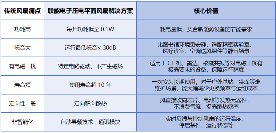傳統(tǒng)風扇存在功耗高、噪音大、有電磁干擾、壽命短、定向性一般、非智能化等 6 大短板,聯(lián)能電子壓電平面風扇逐一攻克: